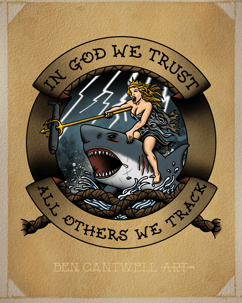 Neptune's daughter with a warface-riding a shark, gripping a trident, and scanning the deep. This is for the sonar techs, bubbleheads, and deep-sea hunters who know the ocean's dark and full of secrets.
